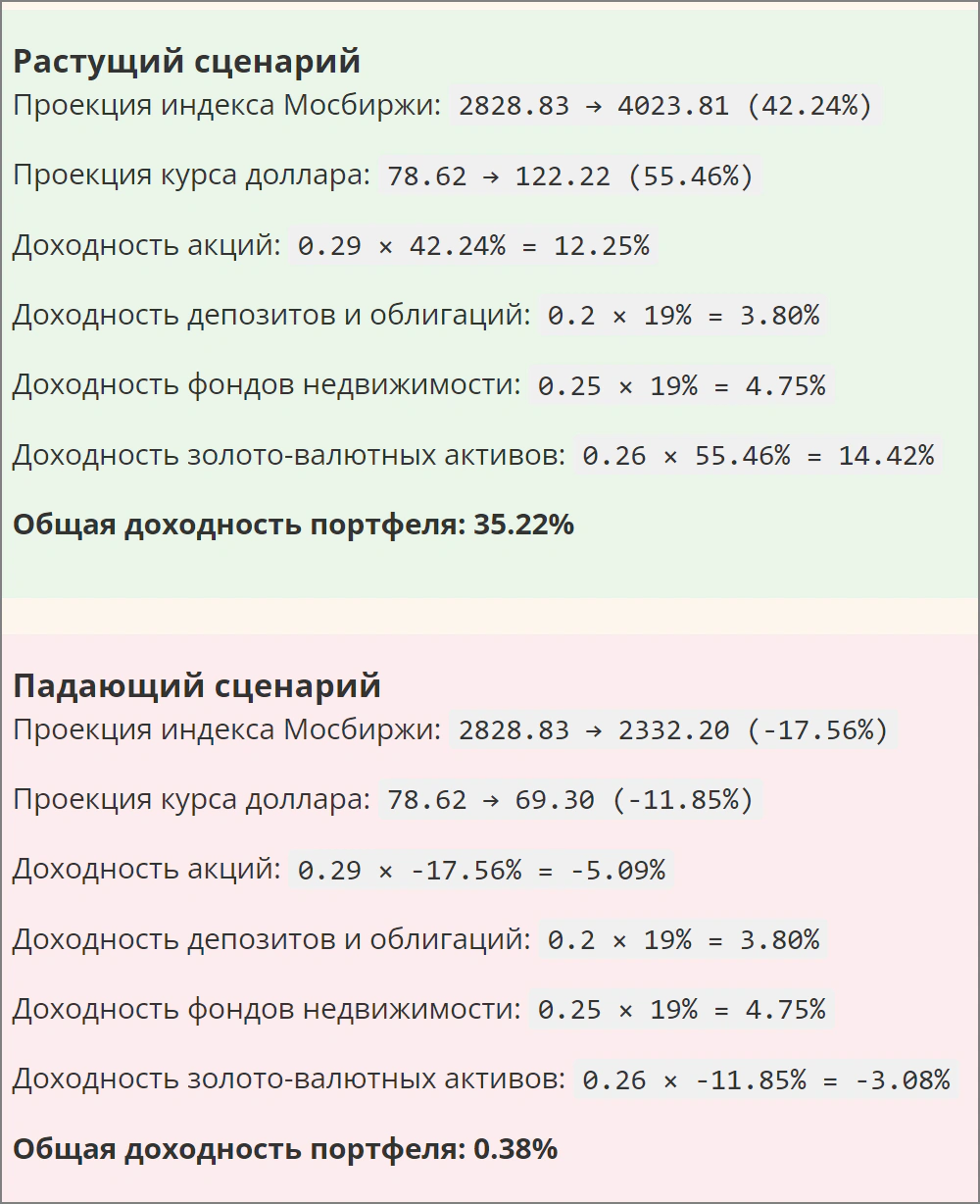 Вводные: акций 30%, депоз. 30%, фондов недвиж.: 25%, валюты: 15%. В сумме всего 100%. Ставка 21%, инд. 2828.83, доллар/рубль 78.62.