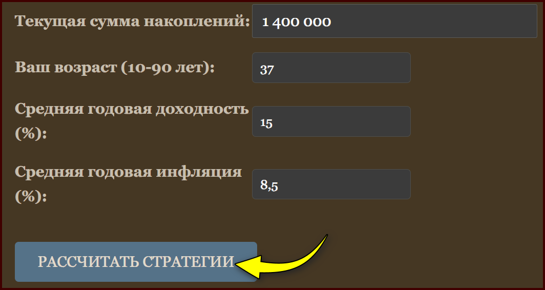 Калькулятор просчитывает 3 стратегии: изъятие 4% от капитала (как рекомендуют в умных книгах), сверх-ифляции (т.е. так, чтобы капитал не уменьшался, и в то же время "кормил" рантье), и "плавное" расходование капитала так, чтобы его хватило до 90 лет (разумеется, все идет с учетом ежемесяных/ежегодных индексаций на инфляцию и на прирост капитала, который вложен под определенный %).